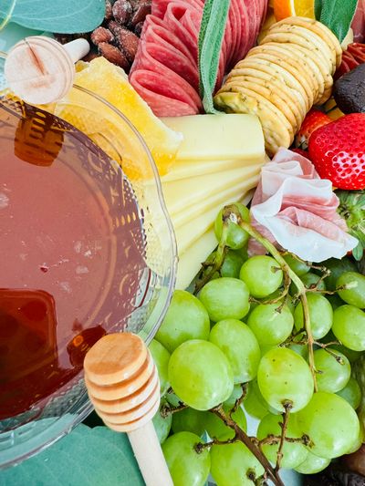 Each arrangement features a curated selection of artisanal cheeses, charcuterie meats, fresh fruits, an assortment of olives / cornichons. Our boards also include specialty jams, exquisite honey, artisanal crackers, and a delightful array of sweet and savory accompaniments carefully chosen to tantalize your taste buds.